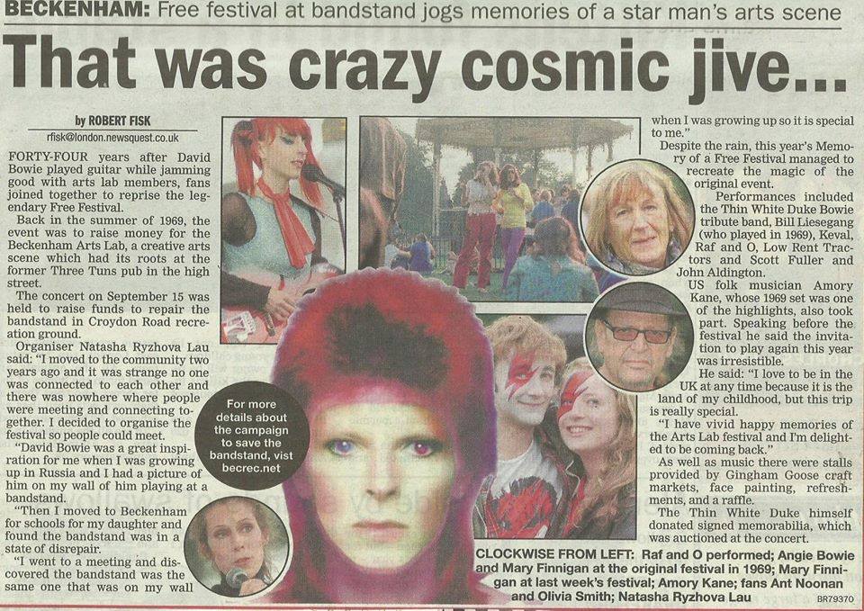 Huge thanks to Luigi Altilia for filming. Further below – ‘Beckenham: Free Festival at bandstand jogs memories of a star man’s arts scene’.